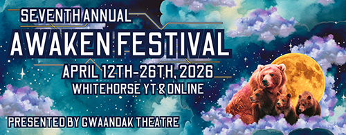 Some in-person events at the Kwanlin Dün Cultural Centre will include three national Performance Showcases (taking place Friday April 24 at 7:00pm and Saturday April 25 at 2:00pm and 7:00pm) as well as the one-day Awaken Theatre Gathering on Sunday April 26 from 10:00am - 4:00pm.